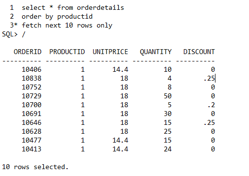 1. Show the first ten rows for table orderdetails in order by productid.