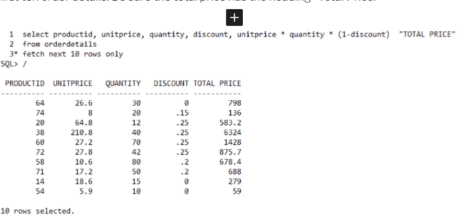 1. For order details, show the product id, unit price, quantity, discount and total price for the first ten order details. Be sure the total price has the heading “Total Price.”