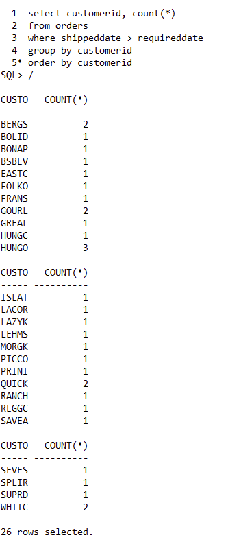 1. Show the customerids and number of orders that were shipped after the required date for each customer.