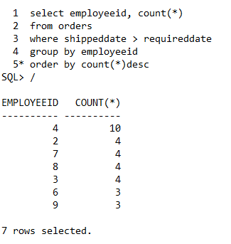 Show the number of orders shipped late (as problem 4) by employee, in descending order by number of late orders.